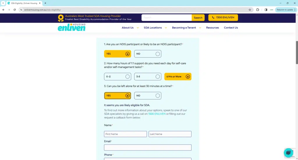We’ve created an intuitive SDA Eligibility Calculator that gives you the ability to undergo a base SDA eligibility check in under 60 seconds. There’s also four new Enliven Housing teams pages to give you complete oversight of what the SDA journey entails, a brand new resource page giving you easy access to the most comprehensive SDA guides in the sector, an intuitive bot-free Live Chat option to instantly engage with our SDA specialists and plenty more.