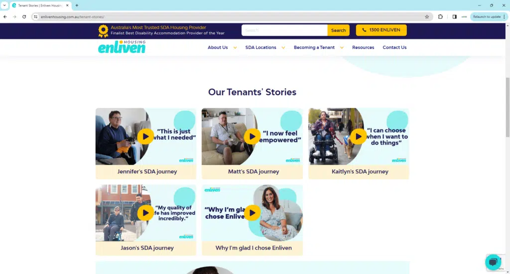 Enliven Housing Founder, Tino Carusi couldn’t be happier with Enliven Housing’s new website platform and its capability to provide Australians with a disability looking or wanting to know more about SDA, the best and most efficient experience possible.