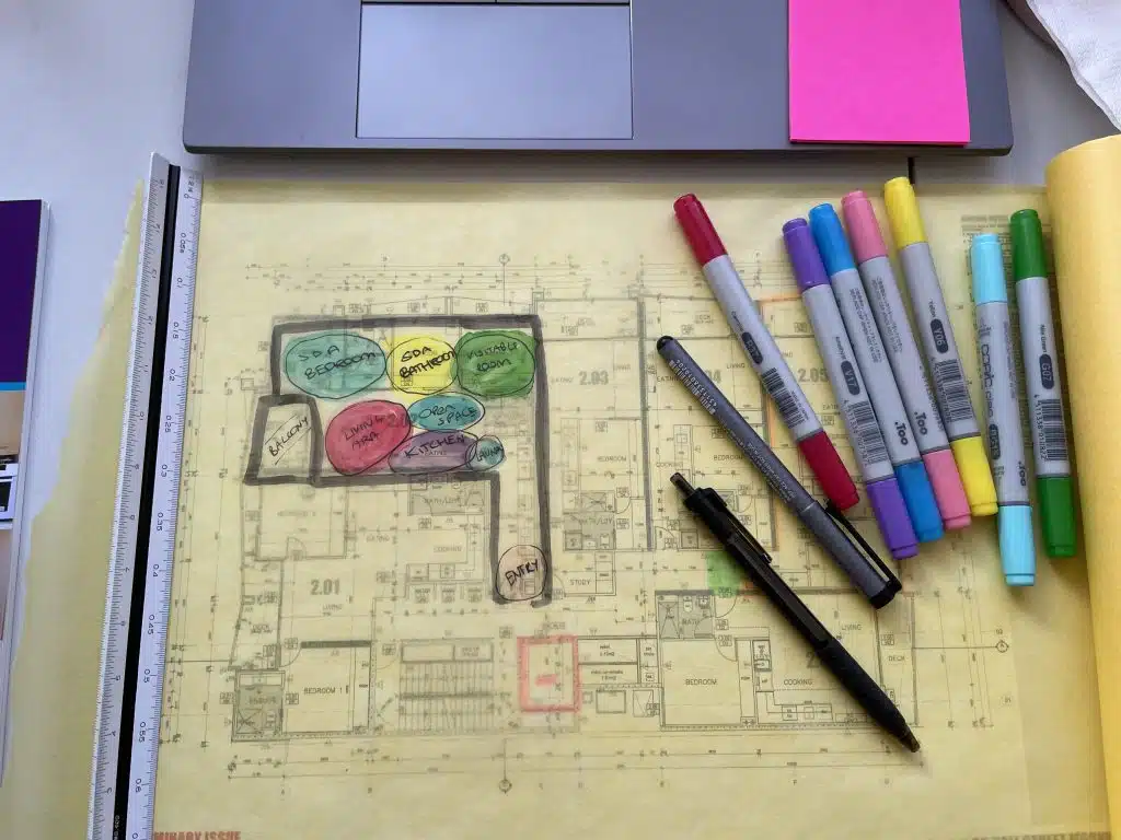 In all the projects that I have been working on there are several design processes that are undertaken during the selection of the SDA units. The initial stages of the design processes are assessing the existing floor plans and identifying the features of the building, the access points such as entry location, ramps, lifts accessibility, and the internal square meterage of each available unit.