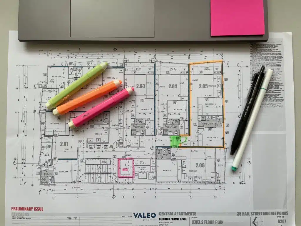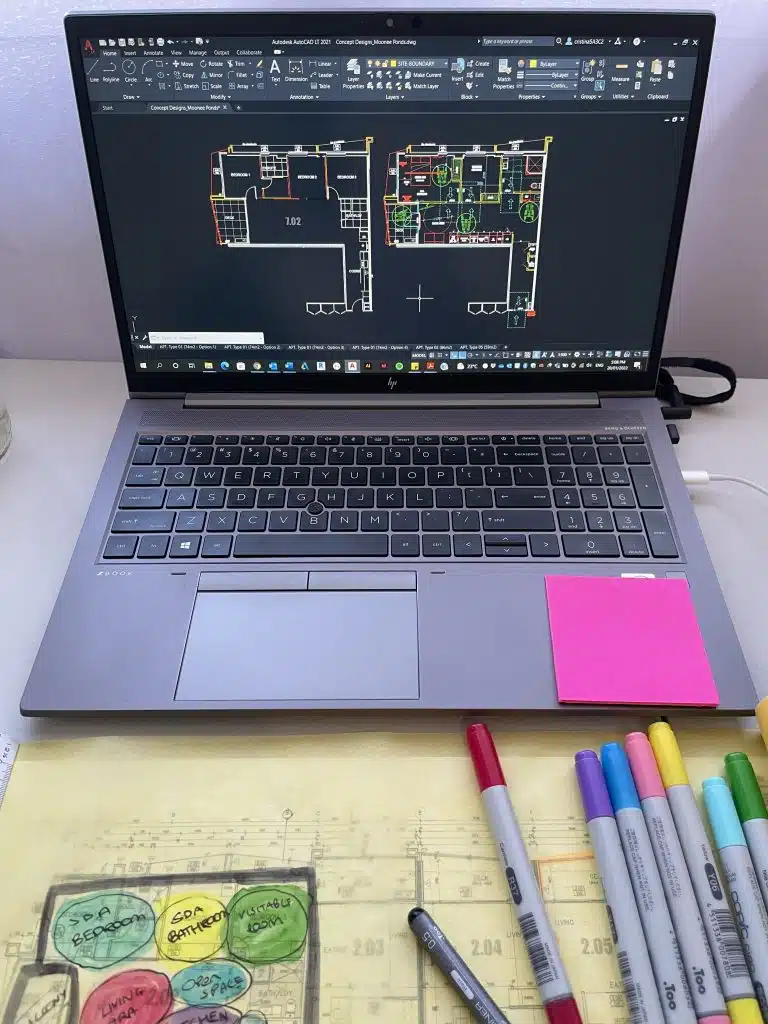 One of the current projects I have been working on is Moonee Ponds in Victoria. It is a nine-storey building and has excellent accessibility, with the entrance starting at ground level with an accessible lift. After examining each floor plan levels, I review the internal square metres of each unit and usually select the ones that can be re-design to fit according to the SDA design standards as a 2 bedroom and 2-bathroom layout.